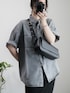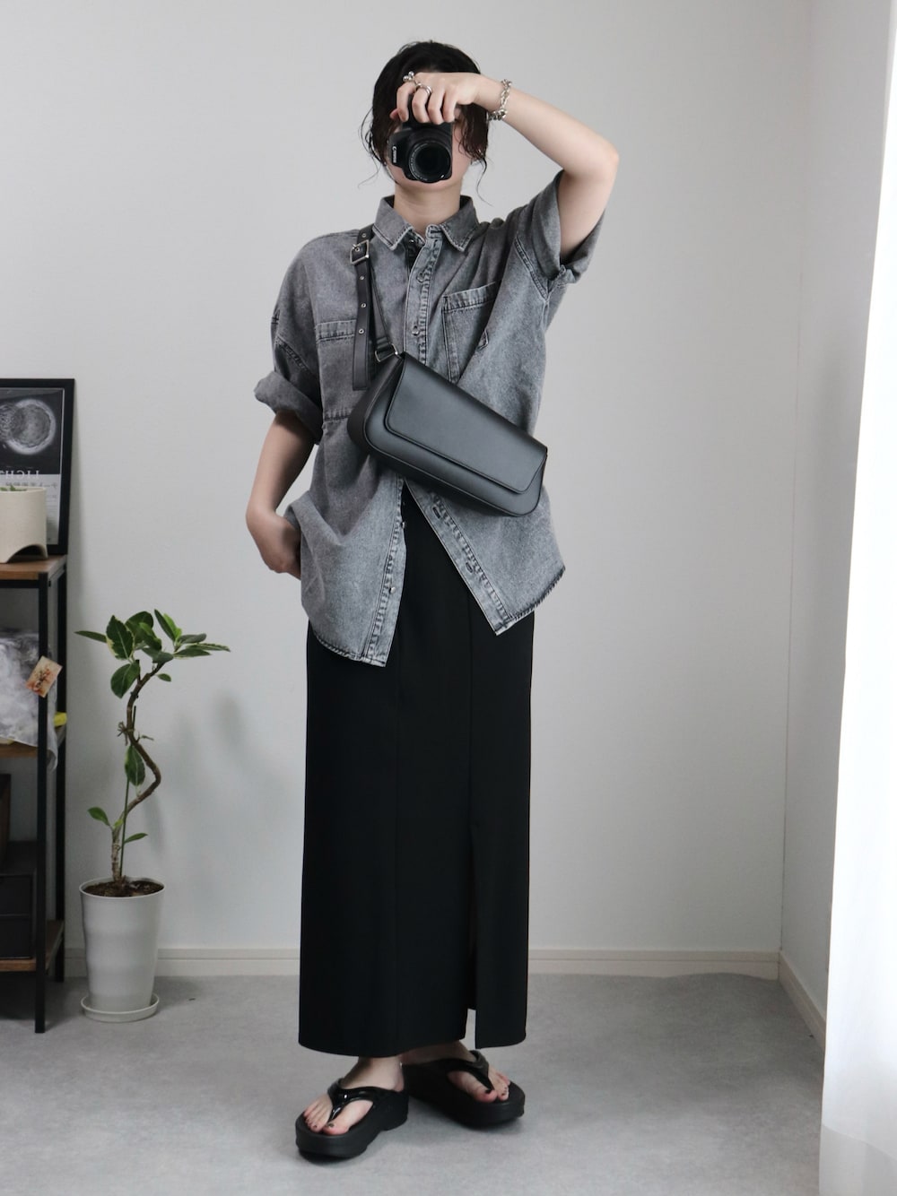 デニムシャツとレザーバッグを合わせてゆるすぎないカジュアルコーデ💿 ▶︎tiptop デニム半袖BIGシャツ ¥1,000オフクーポン出てます🗝️