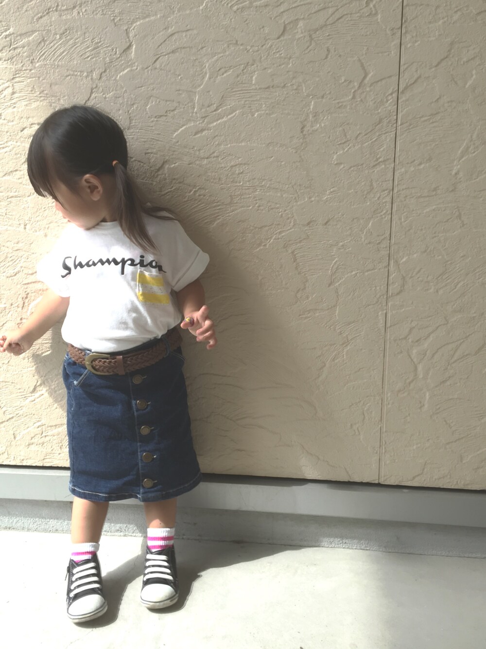 前回と代わり映えのしない コーデでこんにちは笑 Right-onの デニムスカート お店でセールやってて 1400円くらいで買えた😂❣️ 100cmだから 大きいけど...笑 毎日 ママー今日はどこいくー? て聞いてくる娘。 私車ないから いつも歩きなんだけど 娘を歩かせると平気で 1時間以上歩く。 母疲れる。笑 公園より今はひたすら 歩くことにハマってるらしい。 いつこのブーム過ぎるかな😂