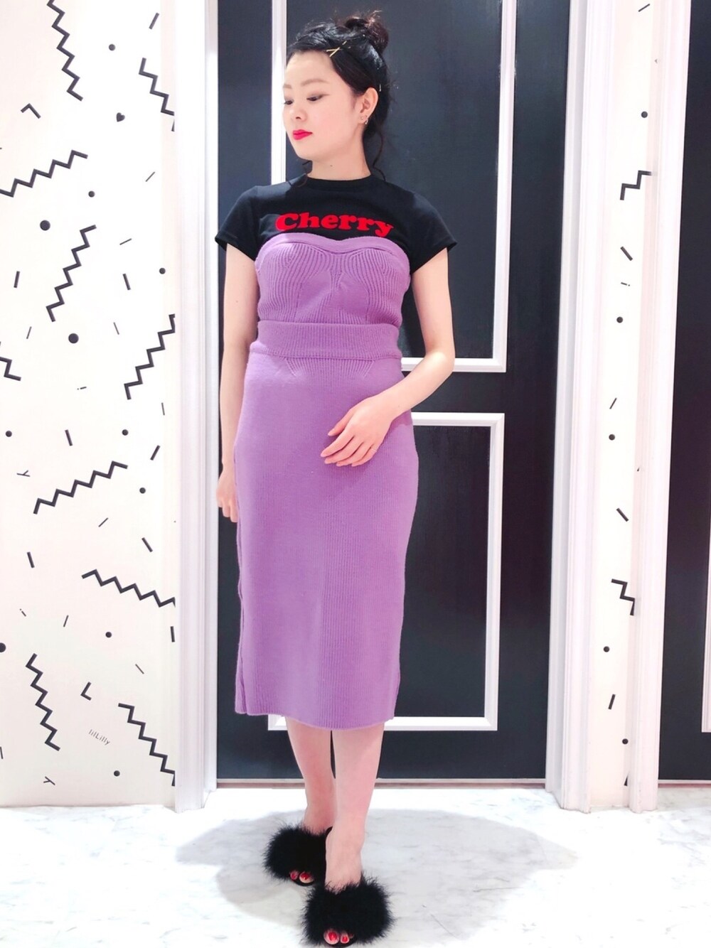 着心地の良いリブニットのセットアップ💜 TシャツとミュールはBLACKを合わせて少し大人っぽくコーディネートしてみました😌💋💄