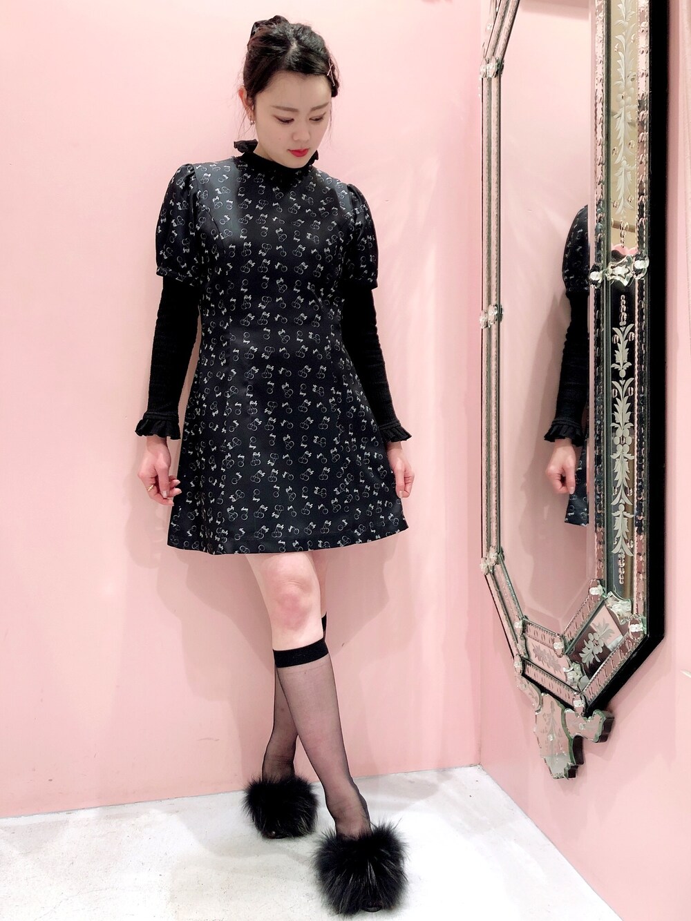 だいすきなチェリー🍒 BLACKで取り入れるとモードで大人っぽいのでおすすめです☺️ ワンピースのシルエットが本当に可愛いです🙆♀️