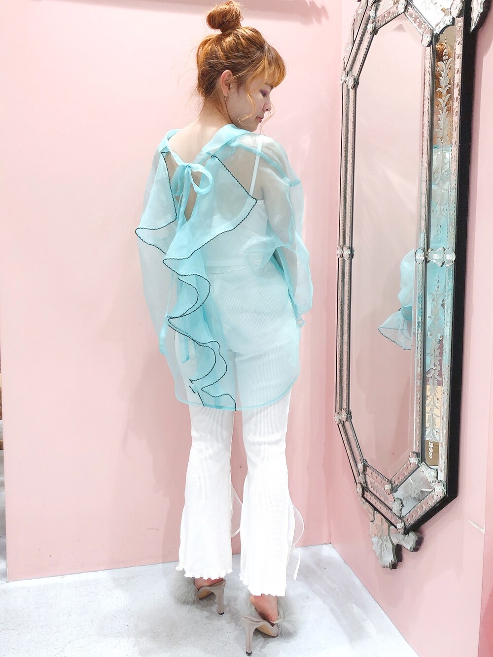 背中のデザインに一目惚れしたブラウス❤︎ 普段はinで着るのが好きですが、このブラウスはアウトで着るのがほんとに可愛いです😍