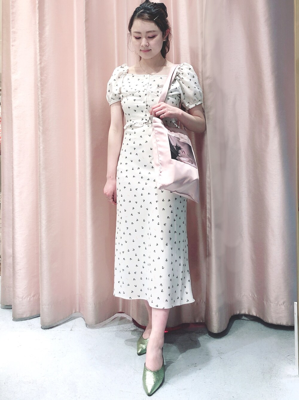 lilLilly×philly chocolate💕🧁 ivoryをセットアップで着てみした☺️ ローズ柄の中にlilLillyとphillyの小さなロゴが散りばめられてて胸キュンです。 155㎝の私でも丈感絶妙です! ウエストがキュッと細く見えるシルエットに感動です💘