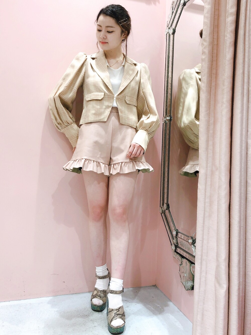 パフスリーブのジャケットの形がとても可愛くてときめきました… 丈感や袖口のデザインがとてもガーリーです💕ショート丈ボトムとの相性も◎です!