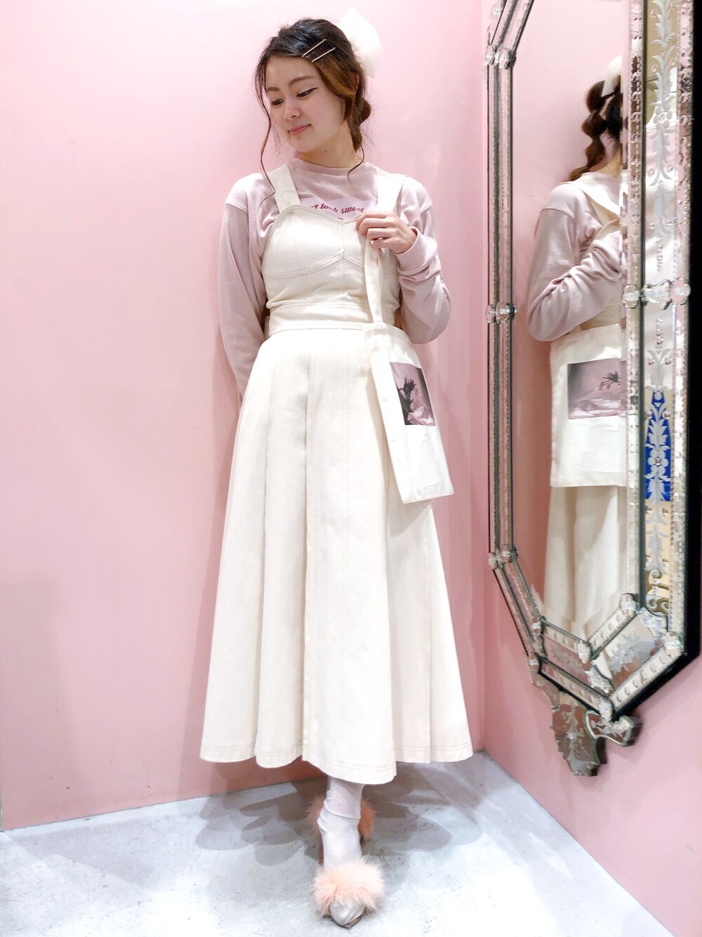 ivory×pinkのコーデがとっても可愛いことに気がつきました🤍💓 ウエストマークの位置が高いので、低身長の私もロングスカートがバランスよく着られました🥰