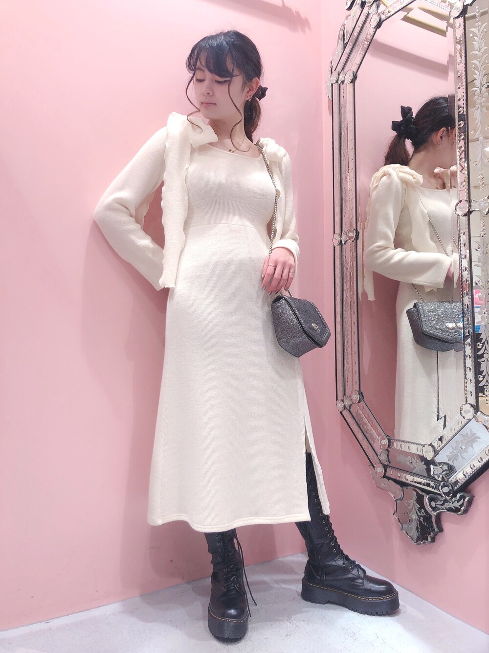 ゆずのワンピース「ショルダーリボンニットワンピース」を使ったコーディネート