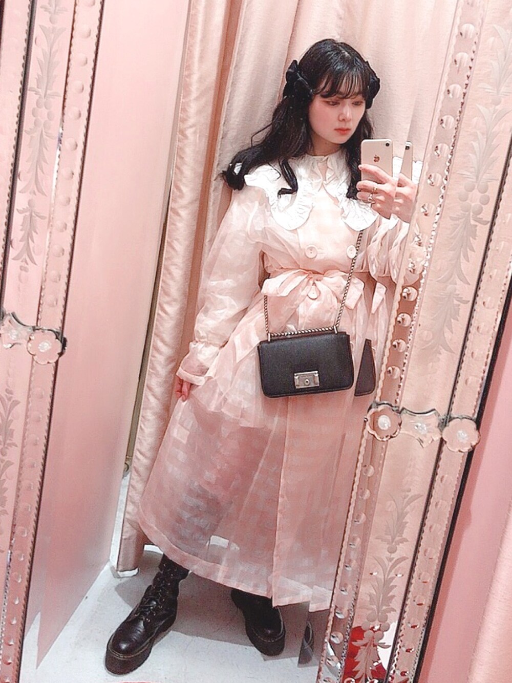 PINK×BLACK ずっと大好きなのですが、ハードになりすぎず甘くまとめたコーデが1番好きです💕 襟の可愛いアイテムを今年はたくさん着回したい😳