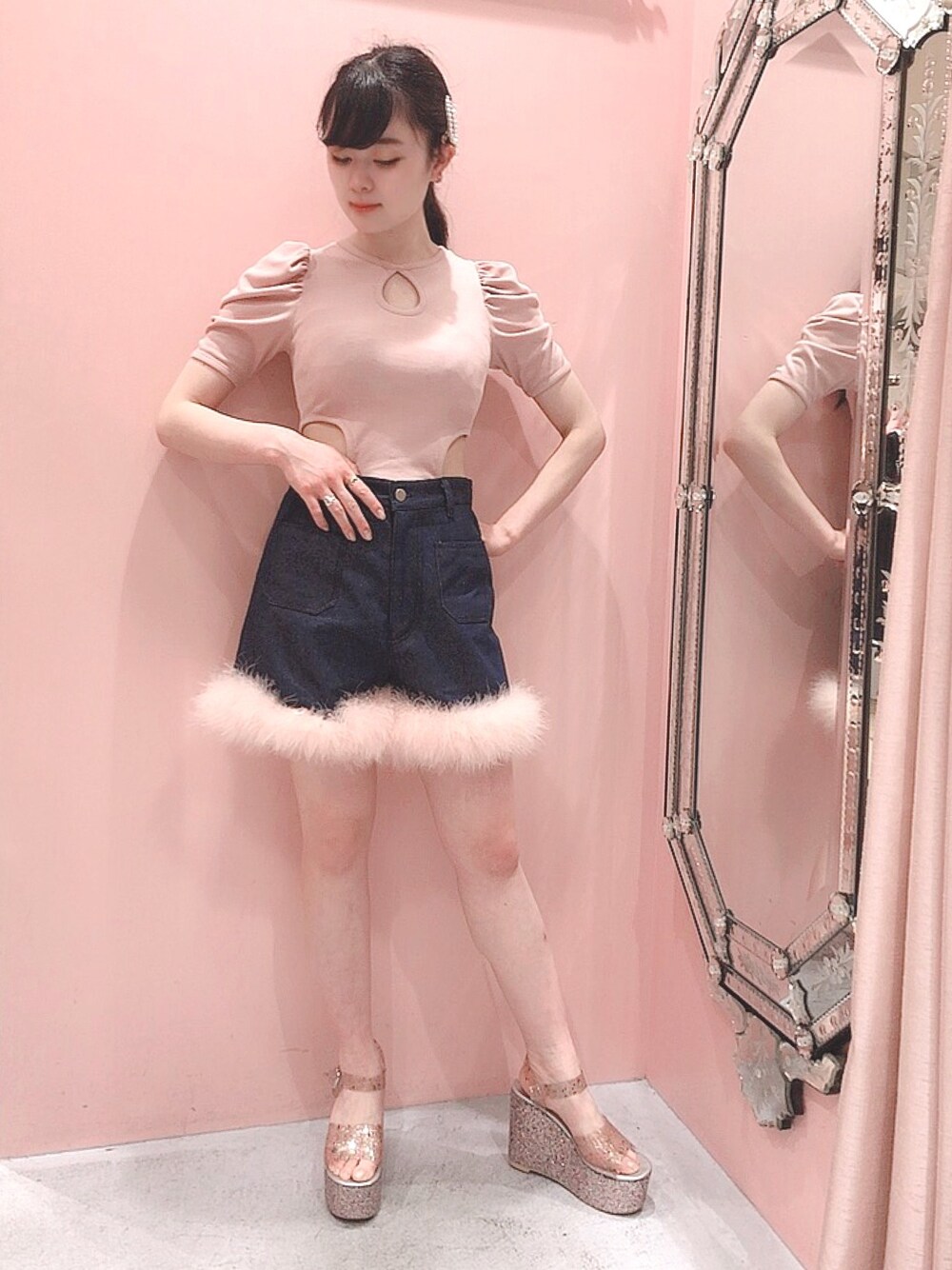 pinkコーデはやっぱり落ち着きます…🎀 ファーのショートパンツとサンダル合わせ足が綺麗に見えるからおすすめの組み合わせです✨✔︎
