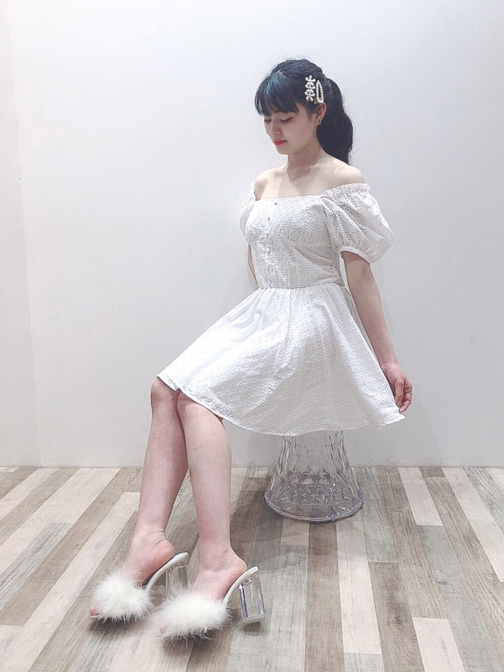 ゆずのワンピース「コットンレースパフミニドレス」を使ったコーディネート