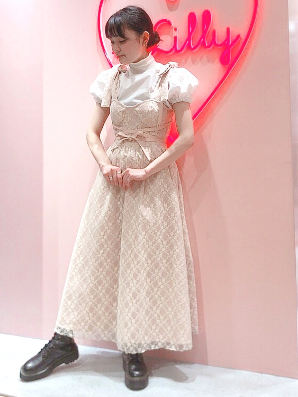 レースドレスにブーツを合わせて少しカジュアルダウンした着こなしがお気に入り♡ pinkのドレスも程よい色味で大人な雰囲気で楽しめるから嬉しい☺️