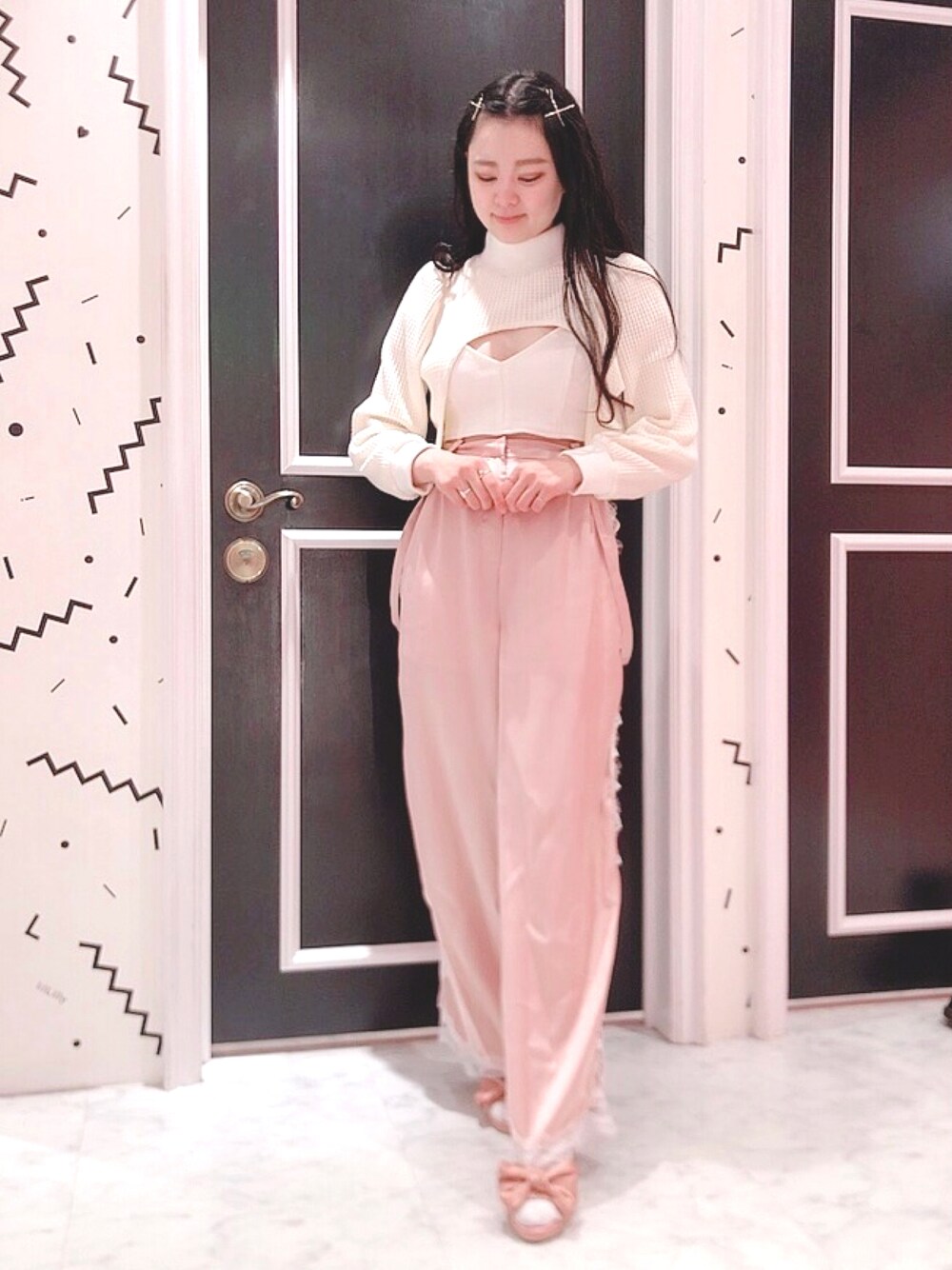 淡いカラーでまとめてガーリーな秋コーデ💕 胸元をチラリと見せた着こなしがお気に入り😊
