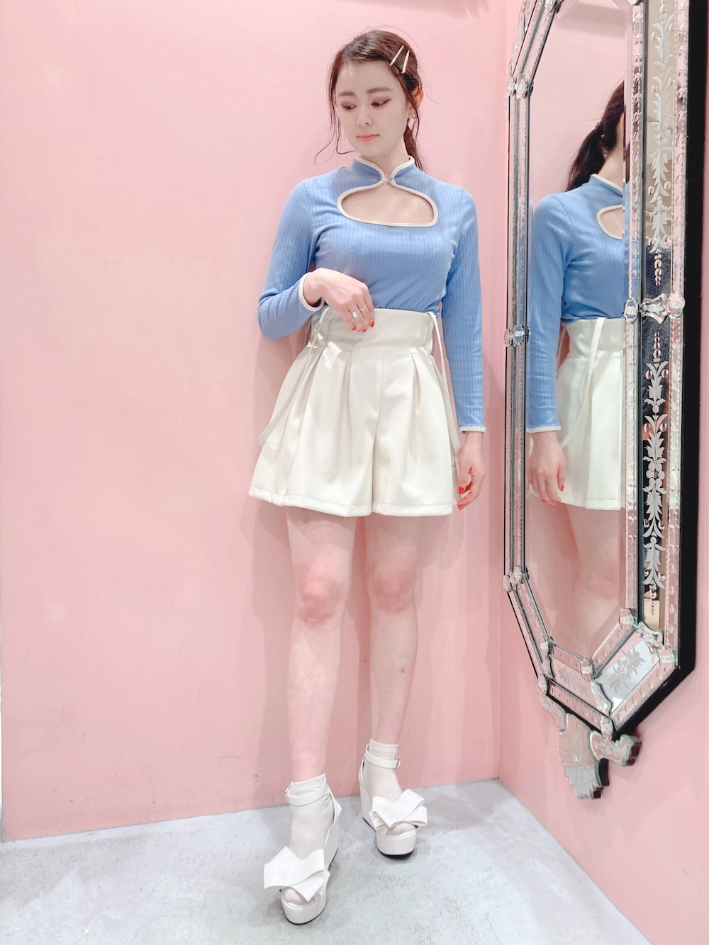 さわやかなBLUE×WHITEコーデ♡ 胸元の肌見せデザインはショートパンツと合わせたコーデが◎