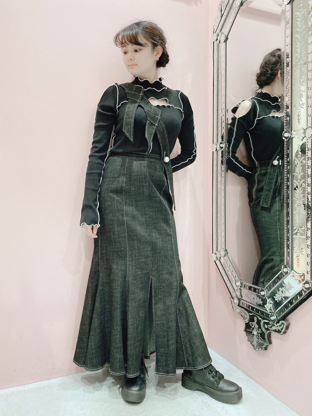 ワントーンコーディネート❤︎❤︎ BLACKでまとめる時はいろんな素材のアイテムを合わせるのが好きです💭 マーメイドスカートお気に入り…!