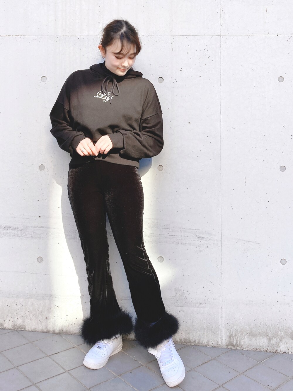 パーカーを合わせる時は カジュアルすぎない雰囲気にまとめたい☺︎ ベロアファーパンツとの合わせはセットアップみたいでかわいい✴︎✴︎✴︎ 足元は白スニーカーで👟☺️