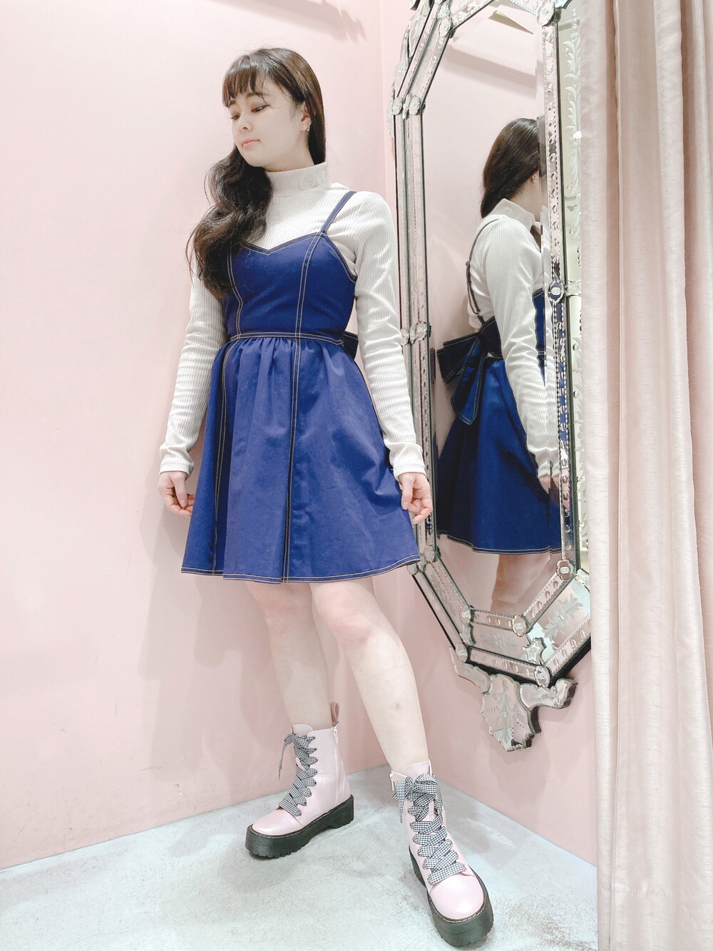 デニムワンピースの背中リボンは愛らしさ抜群。。💗 indigo×pink大好きな私はブーツでpinkをプラスしました✨