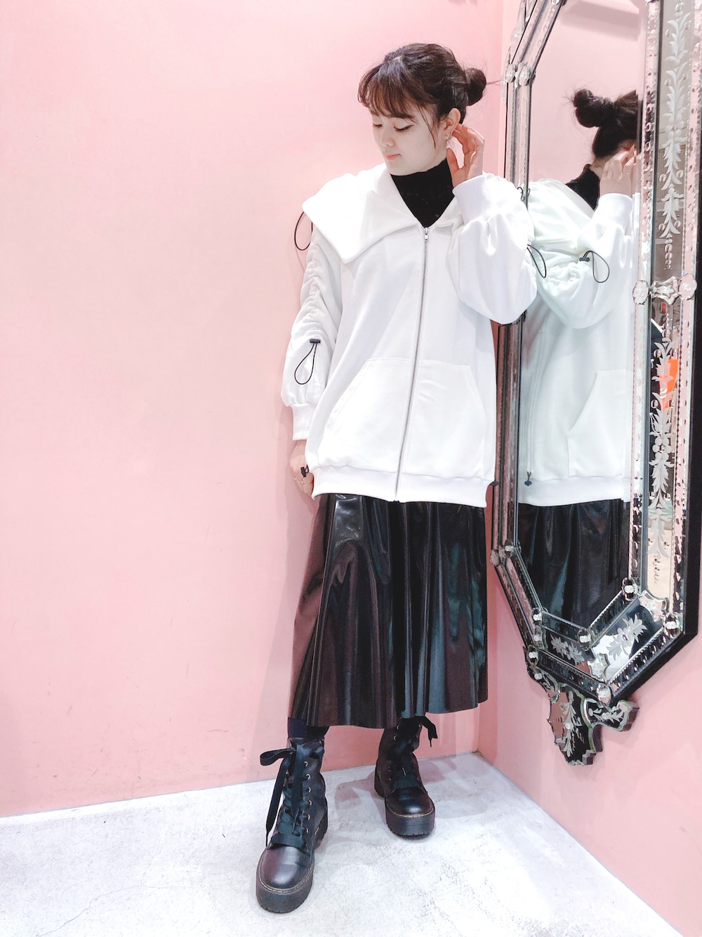 エナメルスカートにパーカーを合わせるとデイリー使いしやすい印象に🙆🏻♀️ 首元からはハイネックトップスを見せて、レイヤーコーデを楽しみます✌🏻