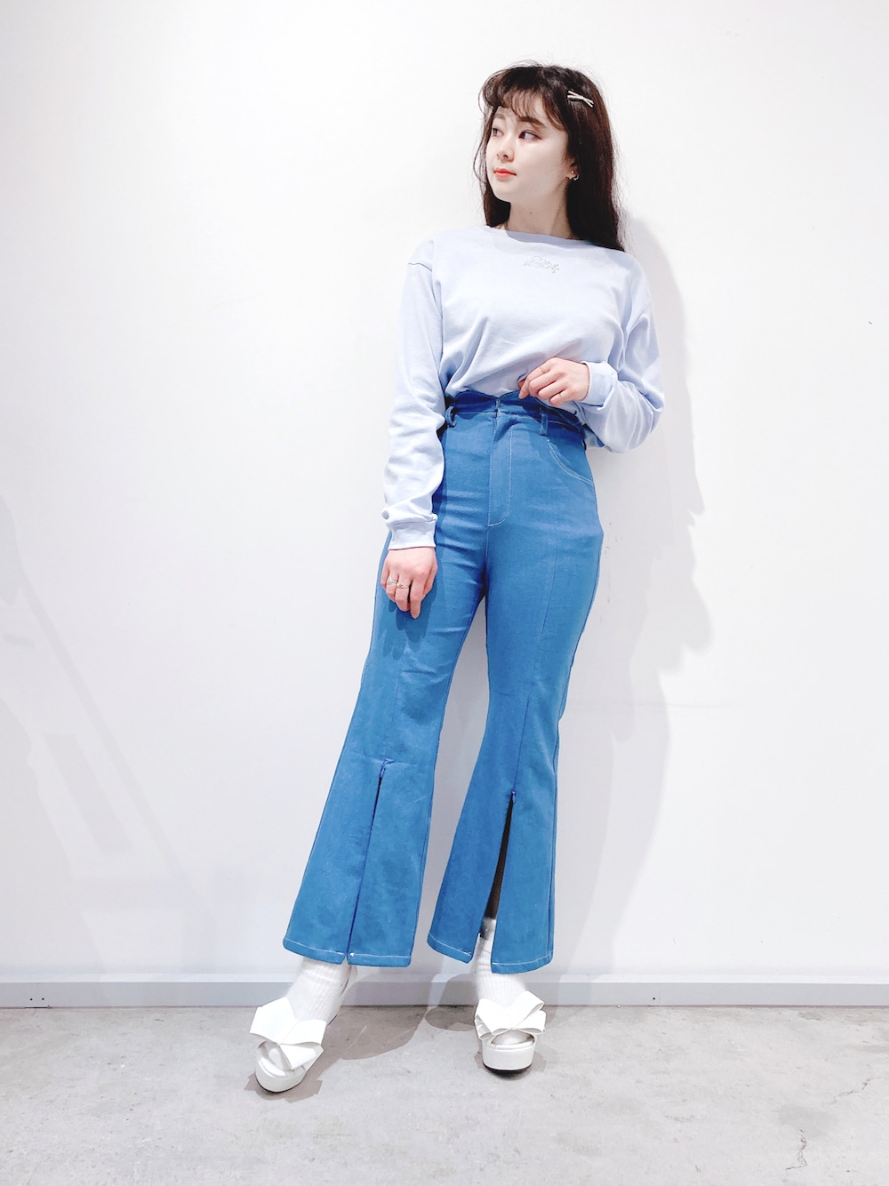 ハイウエストのデニムパンツとロンTでカジュアルに、ヘアとシューズで甘さをプラス…🤍 大好きな春になると少し淡いデニムを履きたくなります🙆🏻♀️