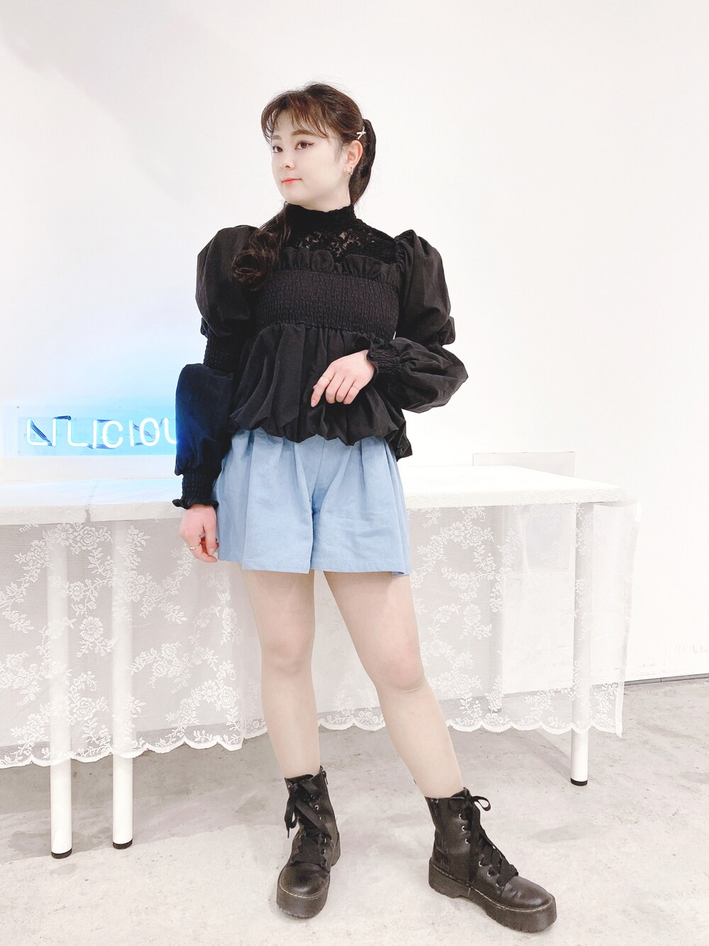 BLACKのブラウスは今すぐ着たいので、レーストップスと合わせています☺️ デニムのショートパンツの丈は足が綺麗に見えるのでお気に入り♡