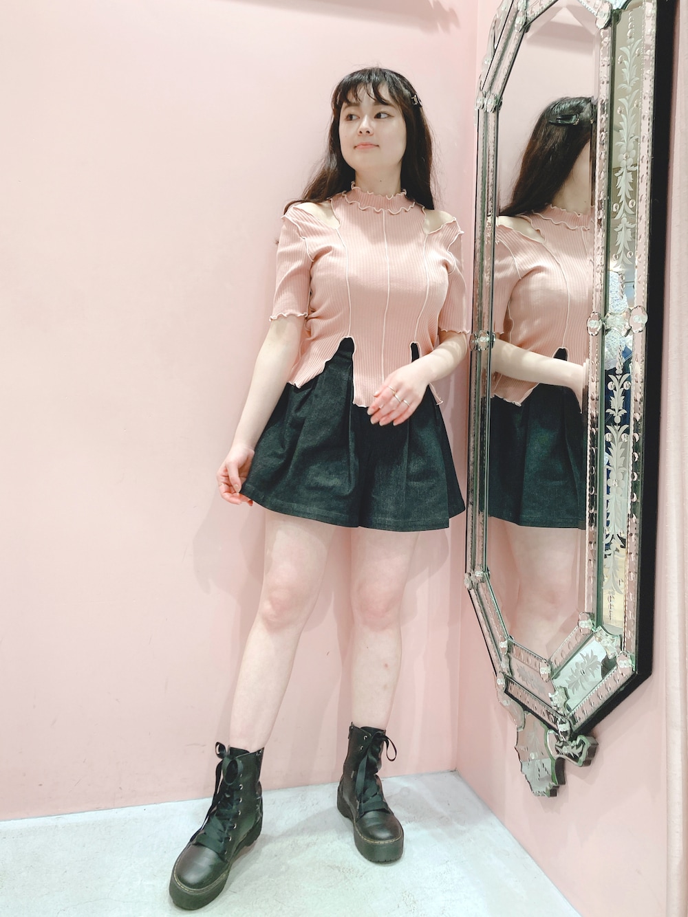 pinkの新作トップスを主役にコーデを組んでみました🎀 デニムのショートパンツはフレアシルエットが足を綺麗に見せてくれるからとってもお気に入り✨