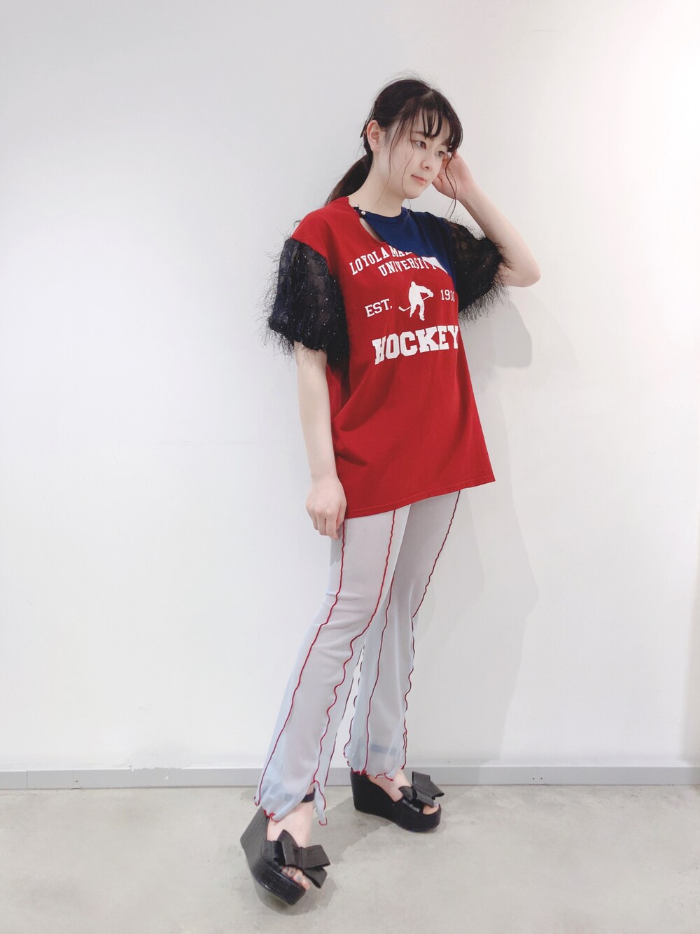 メッシュパンツはロンTやカジュアルな着こなしで楽しむのがおすすめです☺️ REDのラインが可愛いBLUEのパンツにリメイクのTシャツ合わせで、個性たっぷりの自分だけの着こなしに挑戦しました!