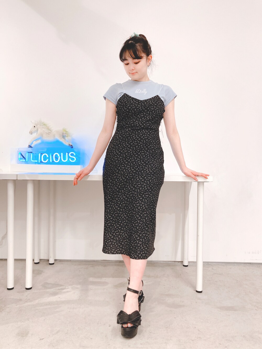 フラワーワンピースにTシャツを合わせて少しカジュアルな印象に…❤︎ アップヘアとキャミワンピースで夏らしくフレッシュにまとめました☺️