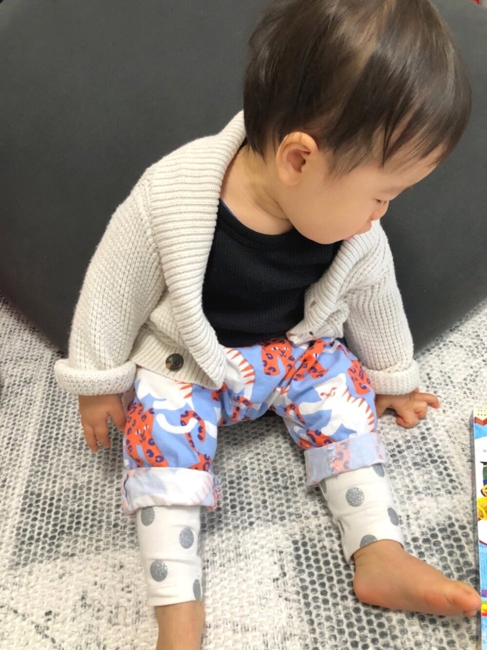 ヒョウ🐆&トラ🐅 、、、柄のネコ🐈?なのか?🤔 秋に履いてたパンツを暖かくなってきたのでまた解禁🙌 派手すぎて他をシンプルにしないといけないけど、お気に入り☺️ 秋に着てたトップスは成長してお腹出るから着れなくなったけど、パンツはギリいけた!助かる!