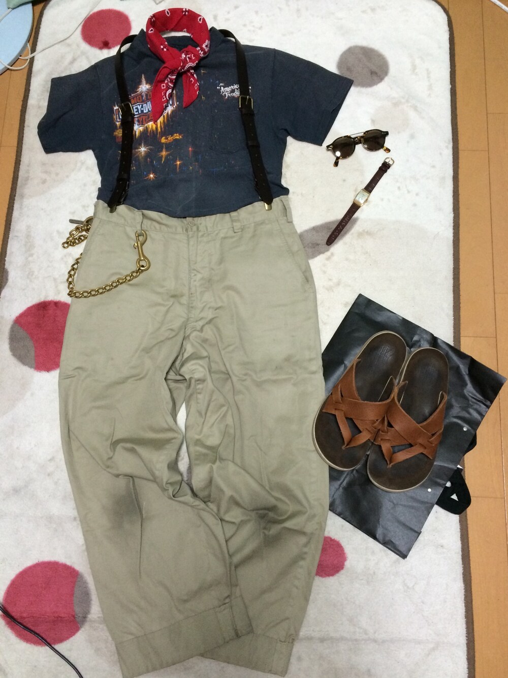 プリント&ポケットTee→Vintage 70's "HARLEY-DAVIDSON" チノパン→Vintage 60's サスペンダー→SUSPENDERs バンダナ→Vintage 60's サンダル→The SANDALMAN サンダルマンのサンダルが優秀です。 ラグランTeeじゃなくてすいません。