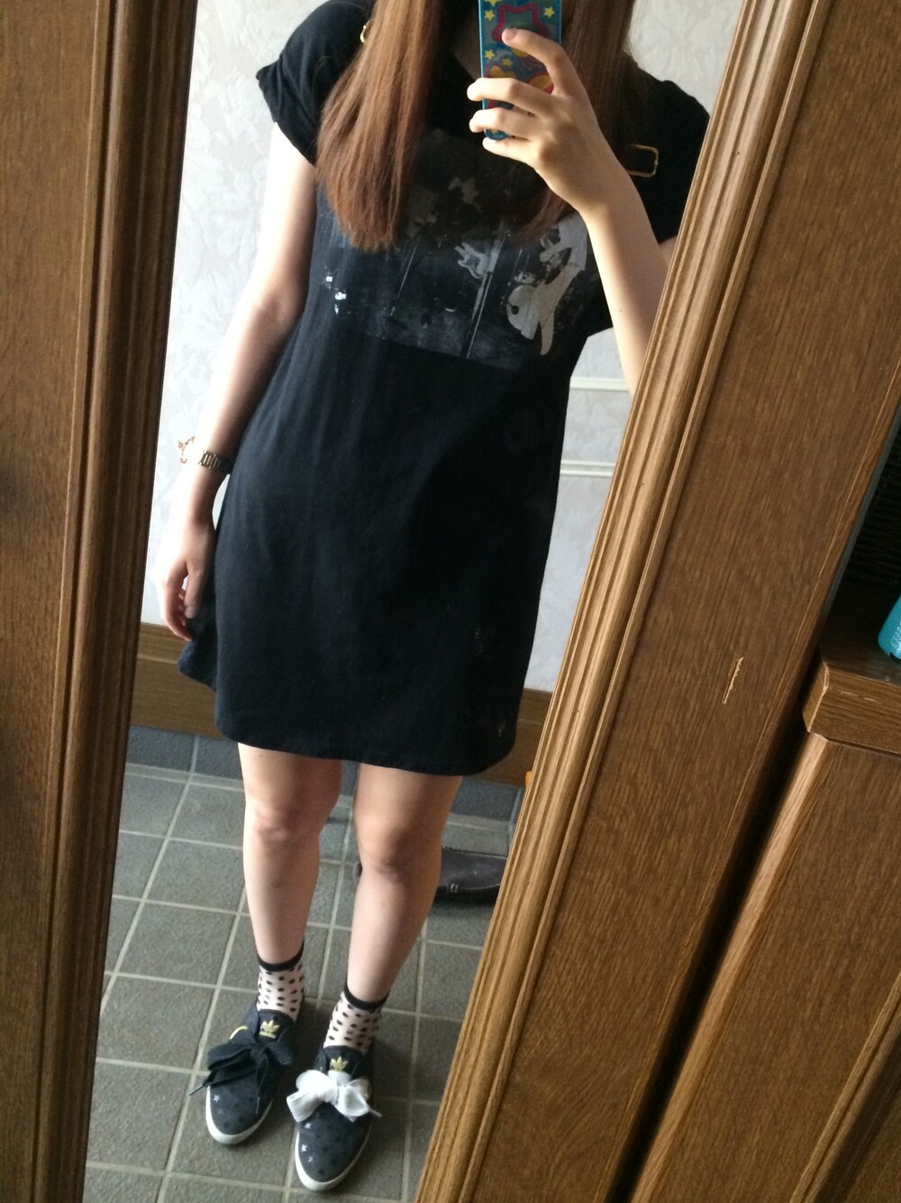 さらっと着るだけでかわいいTシャツワンピ。 靴の紐を左右白黒にしたのがポイント。