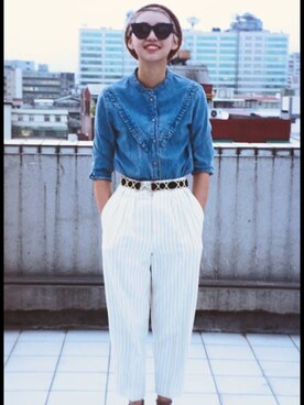 「Hey!Q!のアイテム(シャツ/ブラウス、ブルー系)」を使った、游さん(レディース・163cm)の春コーディネート