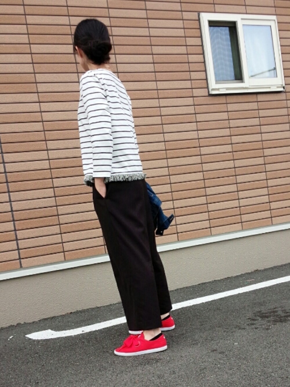 **⭐休日コーデ⭐** ボーダートップスのフリンジがお気に入り😆⤴ ゆるゆるリラックスコーデ❗❗ 自分甘やかしコーデ❗❗