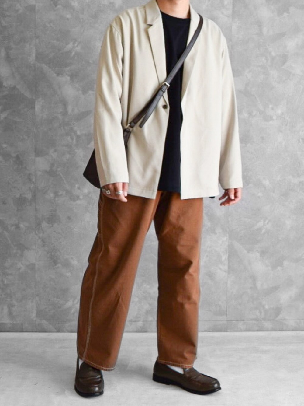 つね。のテーラードジャケット「【MYSELF ABAHOUSE】セットアップ対応 POLY WOOLLY TWILL ポリウーリーツイル オーバーサイズ ジャケット」を使ったコーディネート