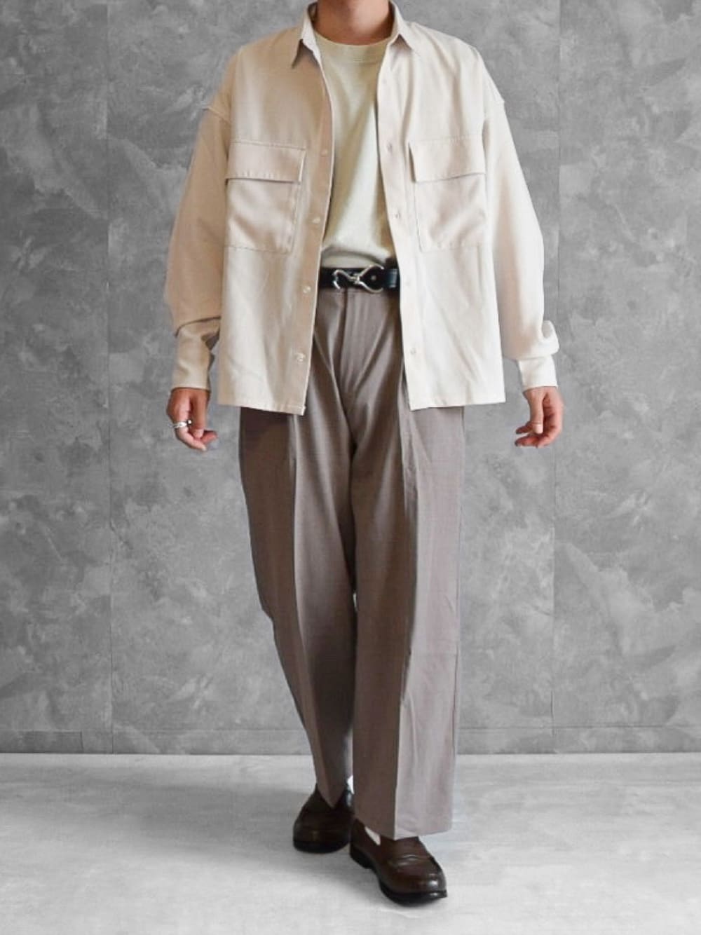 つね。のセットアップ「【セットアップ】ブライトポプリン レギュラーカラーシャツジャケット L/S オーバーサイズ CPOシャツJKT&ワイドアンクルシェフパンツ ワンマイルウェア」を使ったコーディネート