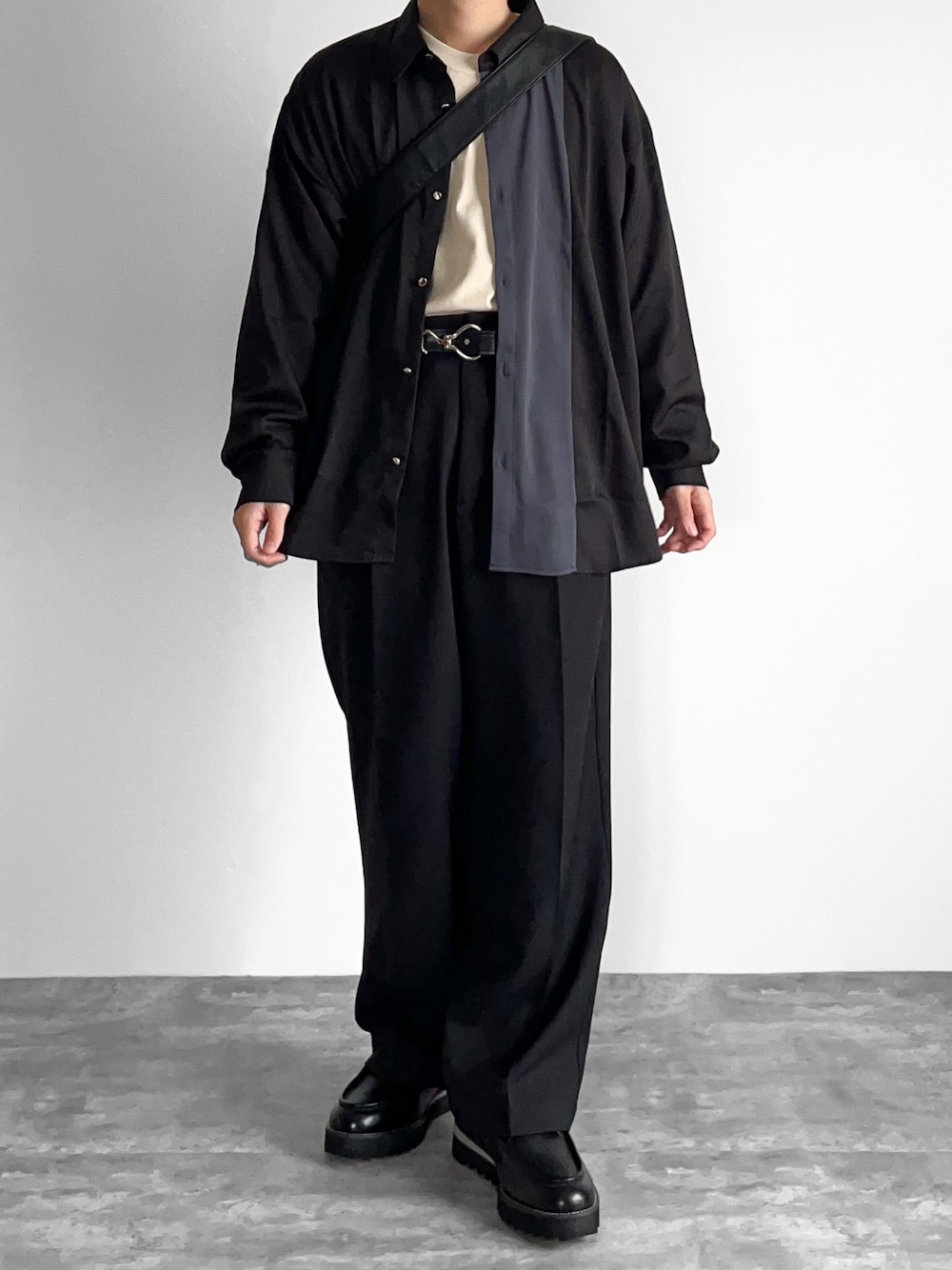 つね。のシャツ/ブラウス「アシンメトリーキリカエ / 襟配色クレリック ドレープとろみ ビッグシルエット長袖シャツ ユニセックス【Confirm】」を使ったコーディネート