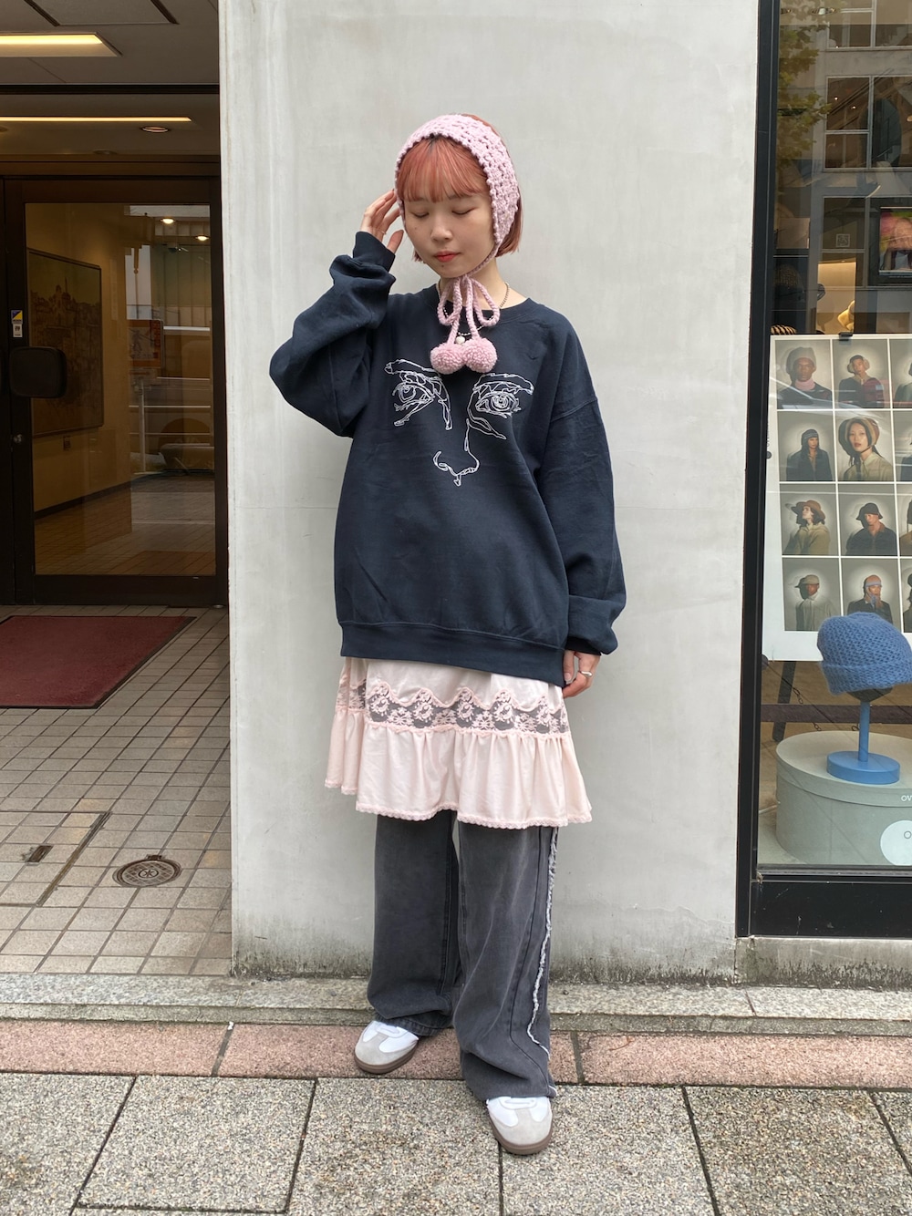 kaorinomoriフォルヘアバンドを使ったコーディネート💕紐先のぽんぽんが可愛い!! ヘアバンドと古着のランジェリースカートの色合わせがポイントです💡