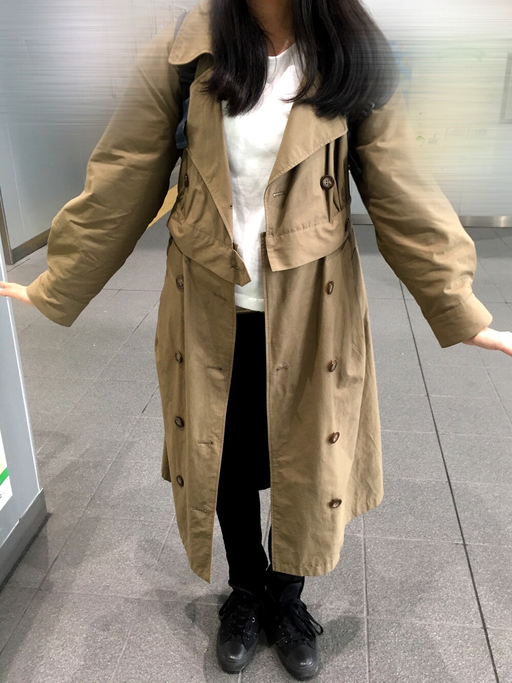 お願いして撮ってもらったから 照れくさくて変なポーズ。 寒かったからトレンチコート。 やっと着れた。 電車に乗る時間が多かったけど コート着てても寒かった。 (2018/11/18)