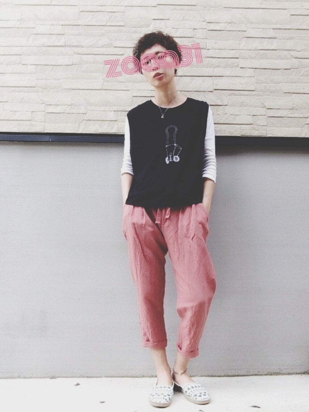 お気に入りの服をいかにダサく着るかをテーマにしてみた 日。 トップス:アメメのおめめ インナー:UNIQLO パンツ:? 靴:GLOBAL WORK