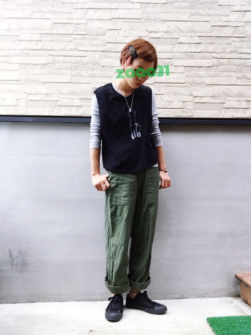 ブラック系のその他トップス、グリーン系のその他パンツ、ブラック系のスニーカーを着用したレディースの夏コーディネートの1枚目の写真