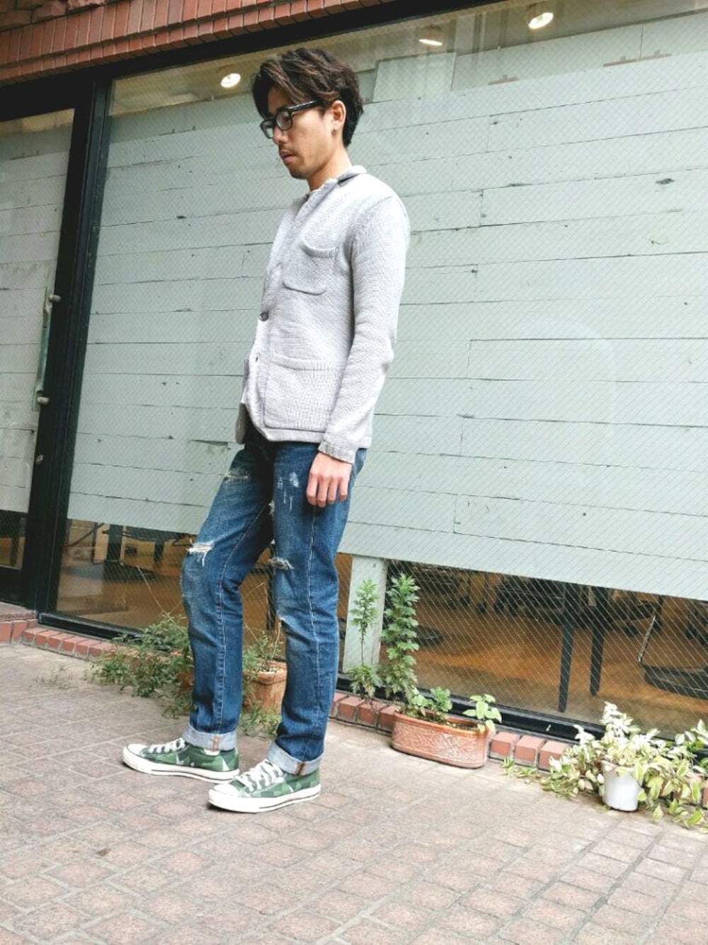今日はニットジャケットで冬っぽく。 だけど冬じゃないのでダメージデニムでさわやかさも取り入れてます。 色味が少ないコーデなのでカモフラ柄のコンバースでさし色にしてまっせー! ってな感じで今日も仕事頑張ります!