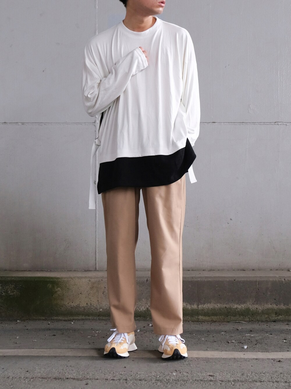 Instagram→wear_zakki レイヤードロンT × スラックス レイヤードロンTにスラックスを合わせたきれいめカジュアルコーデです🙌 レイヤードロンTはCREARE -LINO-様のアイテムです✨ こなれ感が1枚切るだけで出すことのできるロンTになっています! サイドにコードもついてて動きもありとても良きです!! サイズ感もオーバーサイズになっていてかっこいいです!✨ コーデでは、ベージュのスラックスとスニーカーと合わせることでよりこなれ感のあるコーデにしました! ロンTがオーバーサイズなのでパンツは細身なものにすることでメリハリのあるコーデにしました! 〜 Size 〜 Tops : L Pants : Free Shoes : 28
