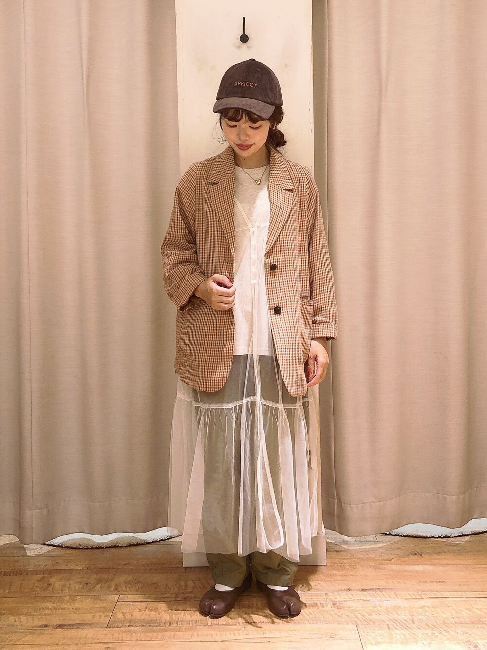 秋のレイヤードコーデ🍇ˎˊ˗ チュールワンピースとパンツを重ねました^^ ジャケットは袖部分に裏地がついているので、袖も通しやすいです◎ どのカラーも可愛いくて悩みましたがナチュラルなカラーに一目惚れして着用カラーのベージュを購入しました🧥💫 是非店頭やオンラインにてご覧ください!