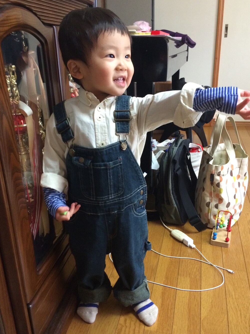 背景ごちゃごちゃ…😭😭 このシャツはパパとママとお揃い(*^^*) オーバーオールはメルカリで安く手に入ってラッキー♡ たくさん着せよう*\(^o^)/*