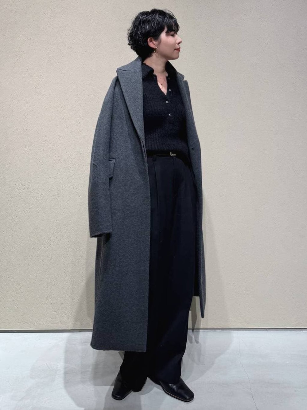 BLACK × GRAYのマニッシュコーデ✨ ムーファニットはスタイリッシュなシルエットですがボディラインを拾わない柔らかなリブが特徴✨ モードでありカジュアルにも...どこか女性らしさも感じるある万能ニットです☺︎ また美しいシルエットのチェルシートラウザーはほどよく艶があるので毛足のあるニットと相性抜群♪ 軽く羽織りごごちの良いチェスターコートでシンプルで洗練された雰囲気に。