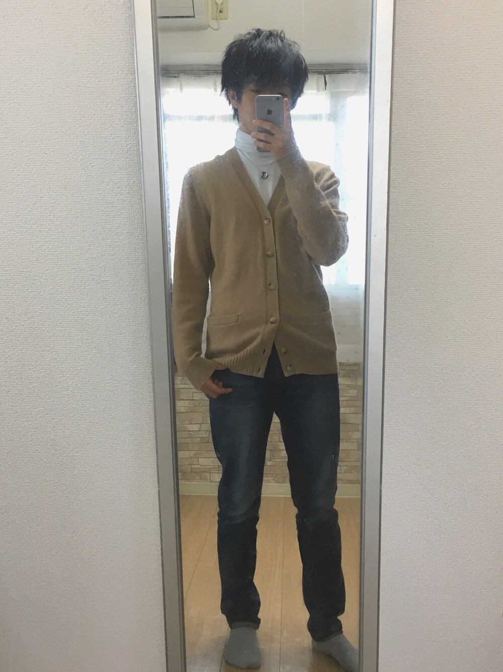 全身UNIQLOコーデ ありきたりな服装で高校生みたいな感じになってるような気がします。 なかはヒートテックなので薄着でも寒くない タートルネックの服を着るのは人生初です 褐色系の服も揃えていきたいですね。