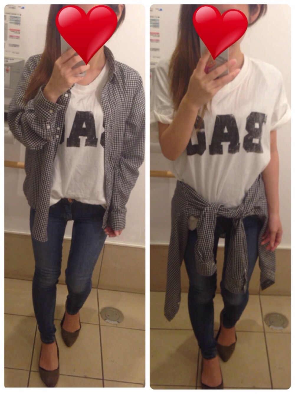 ギンガムチェックシャツ ? BAD Tシャツ ZARA スキニーデニム H&Mkids サイズ間違えて買って 134cm無理矢理履いた♥️笑