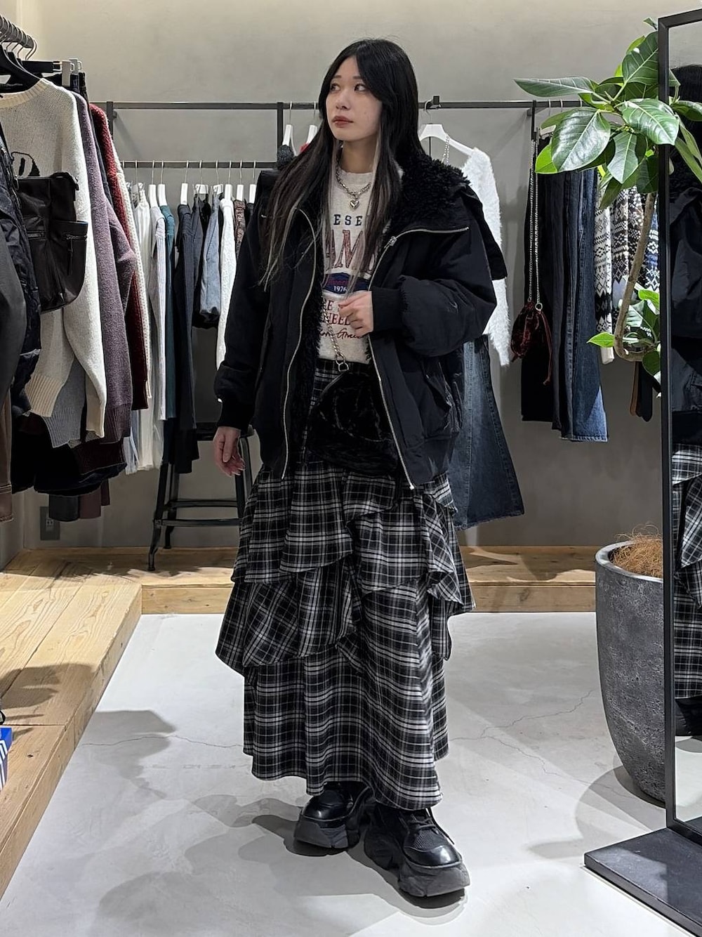 アウター リバーシブルが出来るブルゾン🫢 ナイロンとフェイクファー生地のリバーシブルなので 気分やコーデに合わせてスタイリングできます‼️ 丈感もお尻にかかるぐらいの丈感です! メンズライクやガーリーにも着れる主役級のアウターです‼️ 大きな襟がデザイン性があって他のアウターと差をつけれ、他にない感じで被らない😎👍 襟抜きをして着るとスッキリ見せもできます‼️ トップス 裏起毛じゃないスウェット! ゆったりに着用できて、袖に溜まる感じが 可愛いアイテム💕 ロゴもヴィンテージ加工がしてあって取り入れるだけで 主役級の1枚に‼️ 丈感もお尻まで隠れる安心感のある丈感です😎👍 生地感もちょうどいい生地感なので、 インナーやアウター次第でシーズン長く 使っていただけます‼️ ボトムス チェックで一気に季節感UP⤴️ 秋冬のスカートはちょっと重いイメージがあるんですが、 意外と軽くてウエスト全ゴムなのでストレスフリーで 履けます‼️ フリルだから腰周りとかも広がるイメージが あったんですがこのスカートは腰周りにフリルが無く タイトっぽい感じになっているので、スッキリ見せが 可能✨️🙆♀️