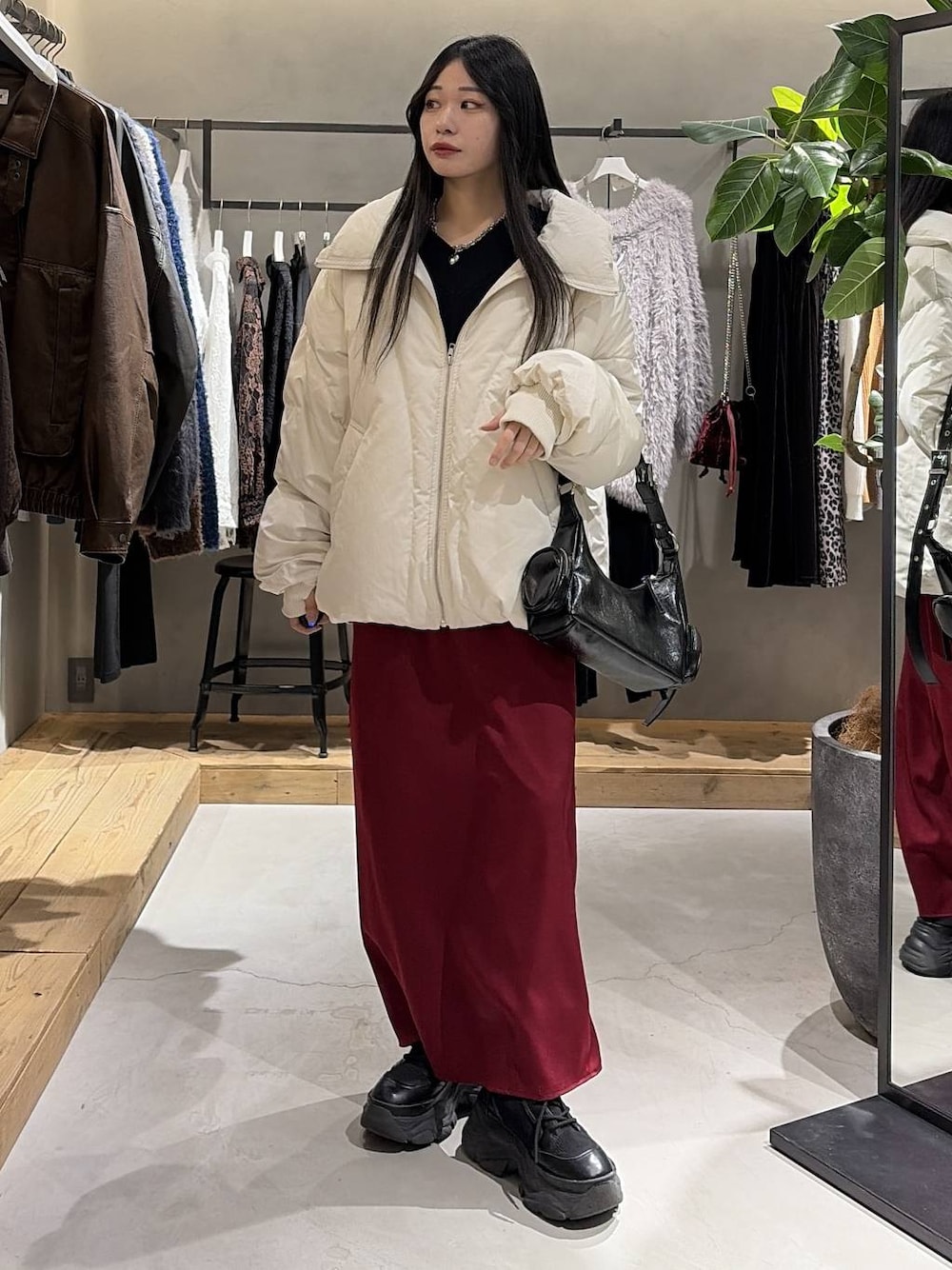 アウター 中綿アウターなのでポカポカレベルの保温力💪 シンプルで色んなコーデにも使いやすく 下にドローコードが付いているので絞れて シルエットが変えられます‼️ 羽織っても軽いので重いアウターが苦手な方 にもオススメできます✨️ スタンダードにできたり、袖に親指を通せる穴があるので マフラー🧣&手袋🧤要らずで暖かい☺️🔆 トップス 2WAYで着用可能! Vネックでキレイめに、クルーネックでカジュアルに 着回しができます❣️ 丈感も短めのショートと長めの丈感があって 長めだとおしりまで隠れる丈感です✨️ 生地感は薄めではあるんですが、インナーでレイヤード をすると冬まで長く使っていただけます‼️ ボトムス サテン生地でサラッとした生地! 柄もそこまで主張する感じもないので、 ボトムスなら柄は着れそうって方にもオススメ✨️ 柄が入るだけでも、いつもと違う雰囲気にもなって マンネリ化も防げる🙆♀️ タイトめのシルエットなので、 ダボッとしたトップスやボリュームが あるアウターとも相性バッチリ✨️