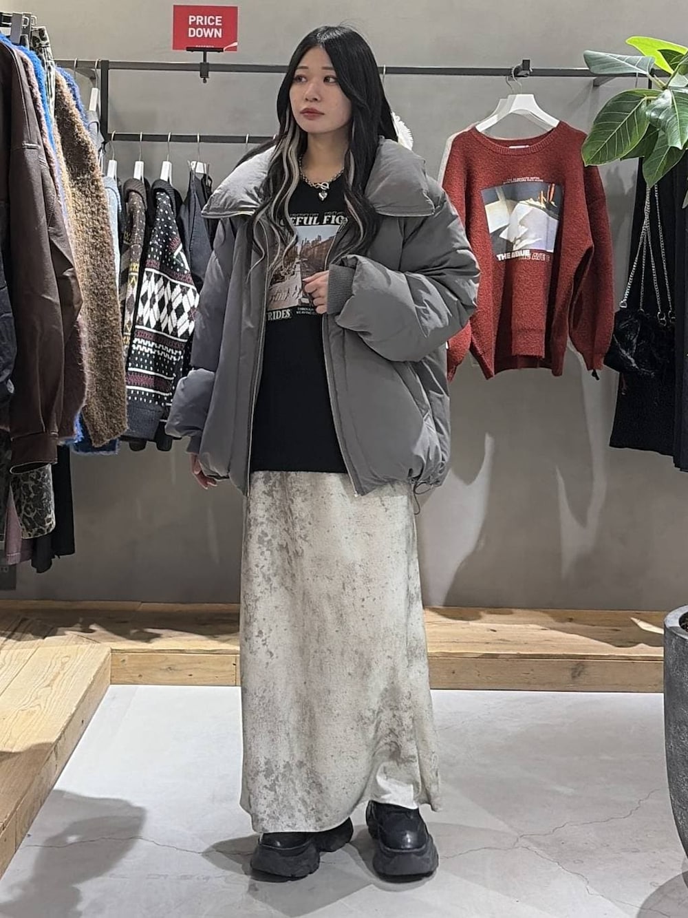 アウター 中綿アウターなのでポカポカレベルの保温力💪 シンプルで色んなコーデにも使いやすく 下にドローコードが付いているので絞れて シルエットが変えられます‼️ 羽織っても軽いので重いアウターが苦手な方 にもオススメできます✨️ スタンダードにできたり、袖にサムホールがあるので マフラー🧣&手袋🧤要らずで暖かい☺️🔆 トップス モチモチな肌触りのニット✨️ 🩶🖤❤️の3色展開で、色で真ん中のフォトの絵柄が 違う‼️ 首も開きすぎずの丁度いい開き具合あので 詰まってるのが苦手・開きすぎるのも 苦手な方にオススメ✨️ 丈感もお尻まで隠れる安心感👍 ボトムス サテン生地でサラッとした生地! 柄もそこまで主張する感じもないので、 ボトムスなら柄は着れそうって方にもオススメ✨️ 柄が入るだけでも、いつもと違う雰囲気にもなって マンネリ化も防げる🙆♀️ タイトめのシルエットなので、 ダボッとしたトップスやボリュームが あるアウターとも相性バッチリ✨️