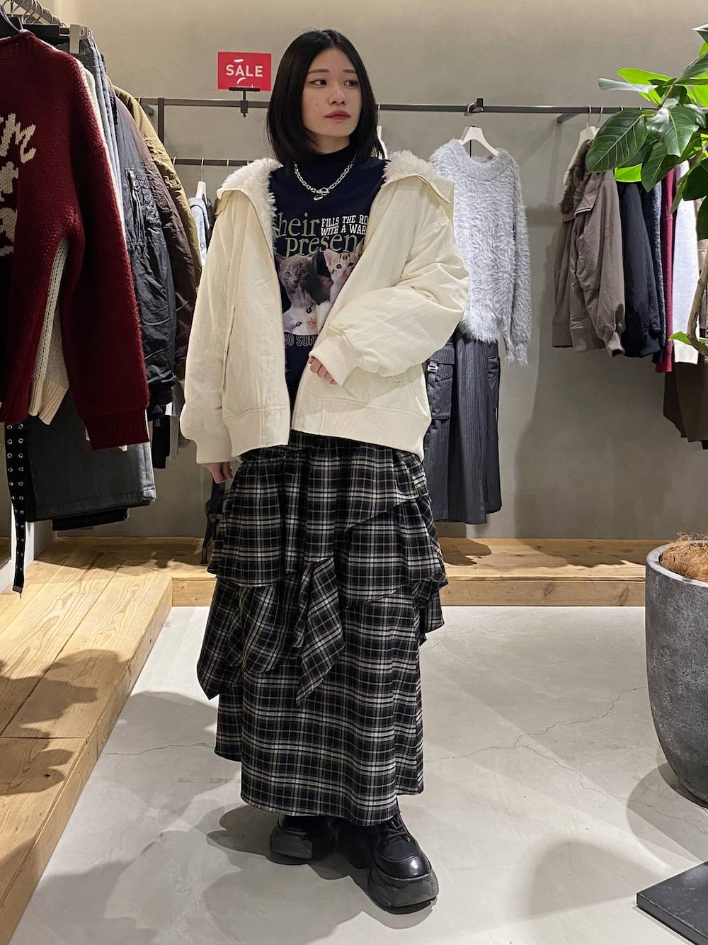 アウター リバーシブルが出来るブルゾン🫢 ナイロンとフェイクファー生地のリバーシブルなので 気分やコーデに合わせてスタイリングできます‼️ 丈感もお尻にかかるぐらいの丈感です! メンズライクやガーリーにも着れる主役級のアウターです‼️ 大きな襟がデザイン性があって他のアウターと差をつけれ、他にない感じで被らない😎👍 襟抜きをして着るとスッキリ見せもできます‼️ ボトムス チェックで一気に季節感UP⤴️ 秋冬のスカートはちょっと重いイメージがあるんですが、 意外と軽くてウエスト全ゴムなのでストレスフリーで 履けます‼️ フリルだから腰周りとかも広がるイメージが あったんですがこのスカートは腰周りにフリルが無く タイトっぽい感じになっているので、スッキリ見せが 可能✨️🙆♀️