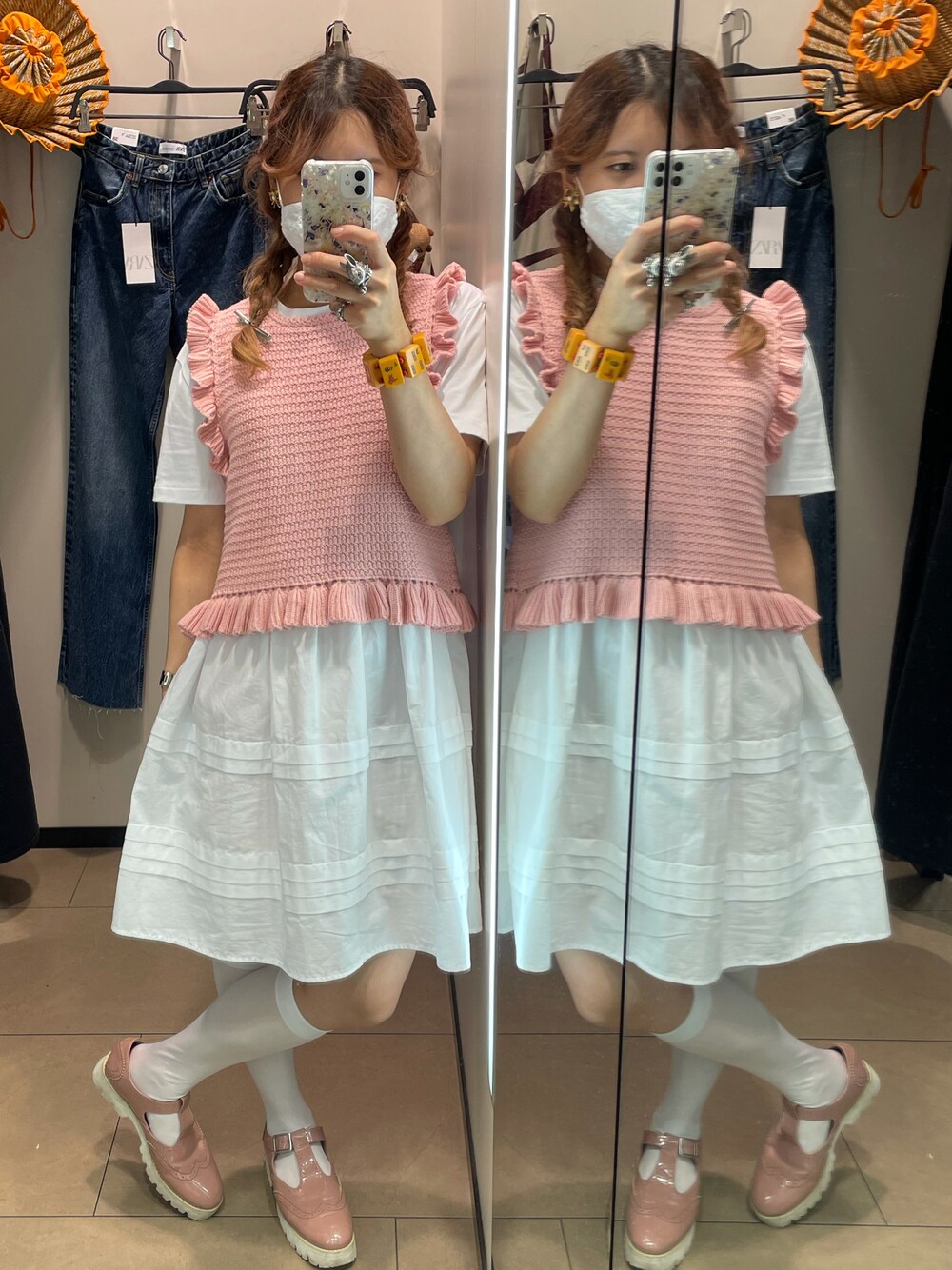 めっちゃZARAの試着室🤭笑 この組み合わせで試着したらめっちゃ可愛かったから購入🥰 20代後半やけど年齢関係なく永遠に可愛いの着ていたい🐰💓