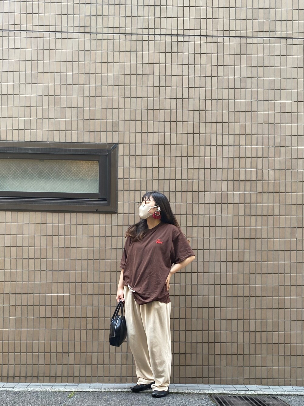 …本当にこのパンツ楽で履きやすくて動きやすいからみんなに買って欲しいレベル🦫 Tシャツの胸元の赤の刺繍とピアスの色を揃えたの🦫♥️ 最近人中とおでこの汗がやばくて萎えてる