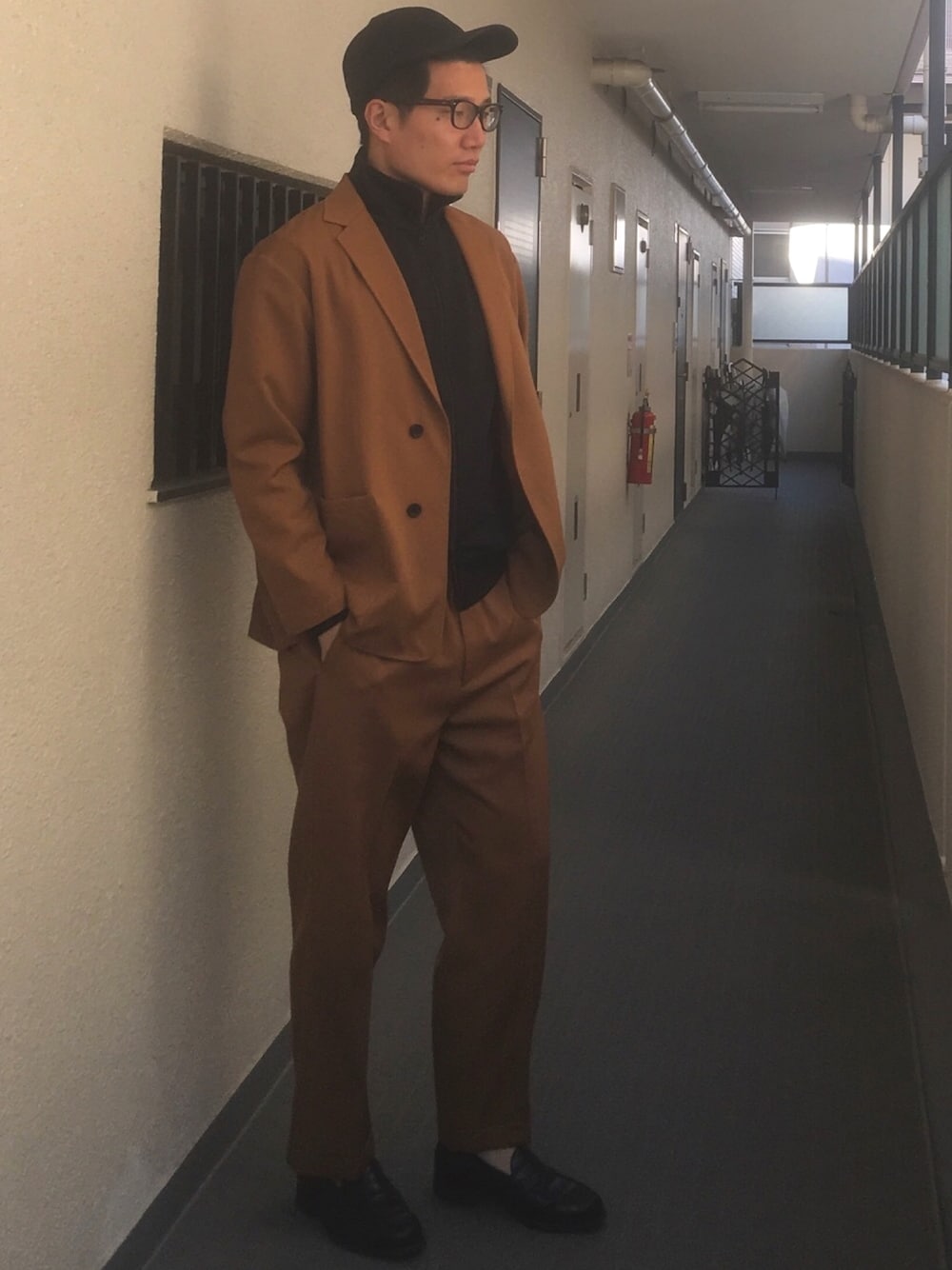 緩めシルエットのブラウンのセットアップにローファー。ジャージをインナーとして入れてみました。 ユニクロのウールキャップは安いのに色味や素材が良くてお気に入りです。